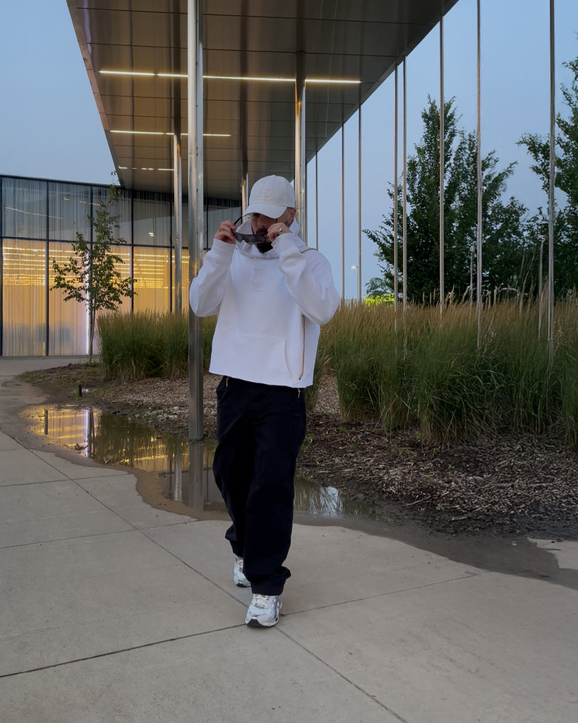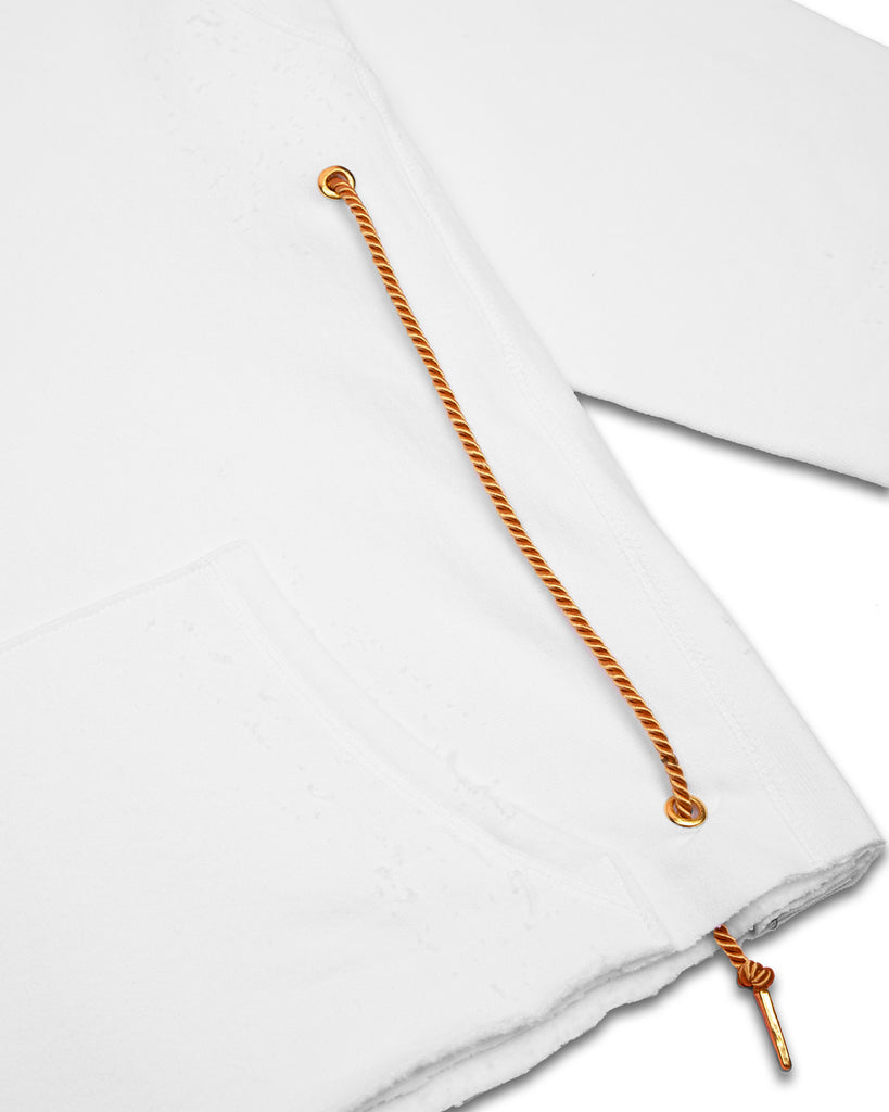 Our new CDR hoodie in white: Cropped and distressed throughout with our signature gold braided rope design. This hoodie is made with the same premium heavyweight cotton used in our classics. All details are unique as they are distressed in house by hand. Features our EL logo distressed on the front and distressing throughout. Gold braided rope goes through gold eyelets on the shoulders and each side for a unique original look.