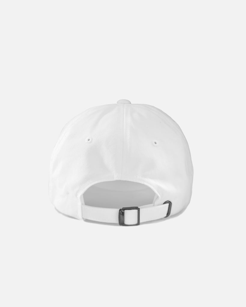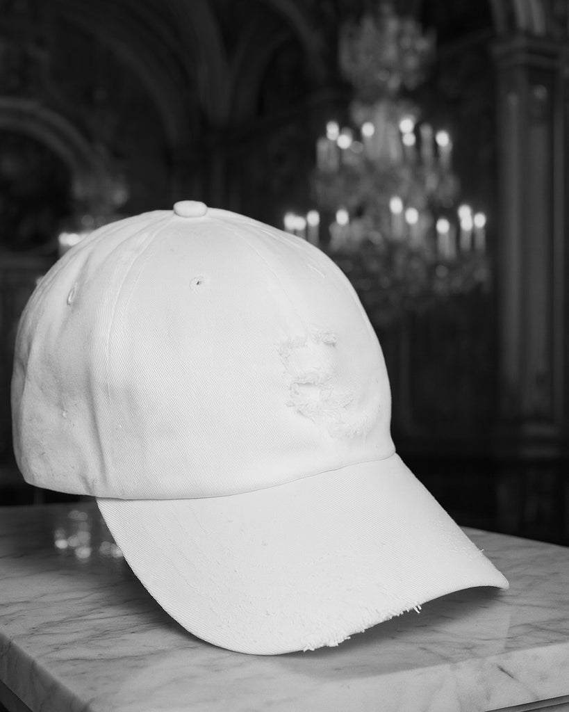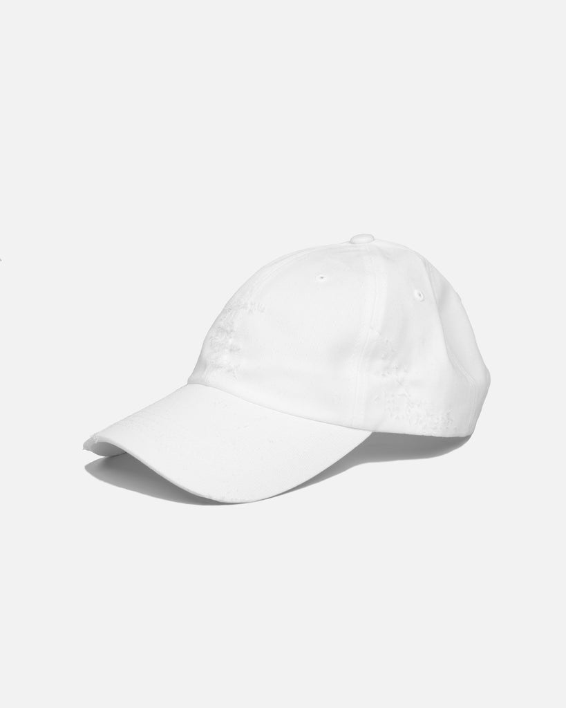The EL distressed hat in white: unstructured strapback featuring our iconic EL logo. Each piece is hand distressed in-house, making every hat unique.