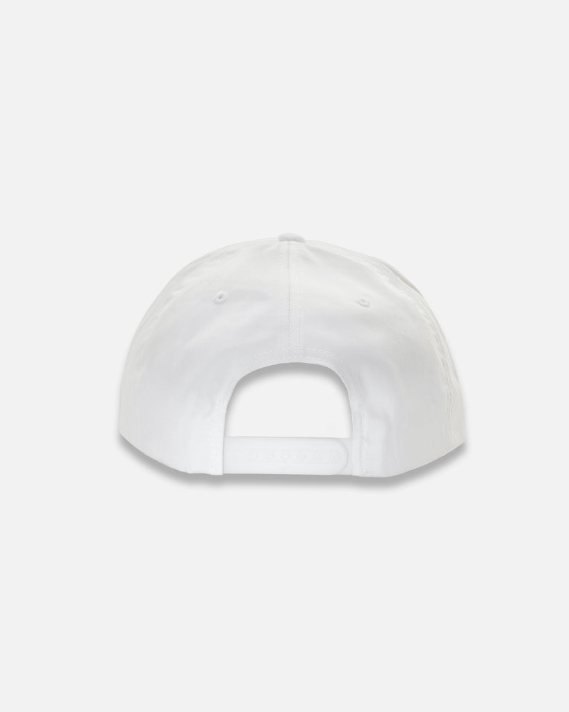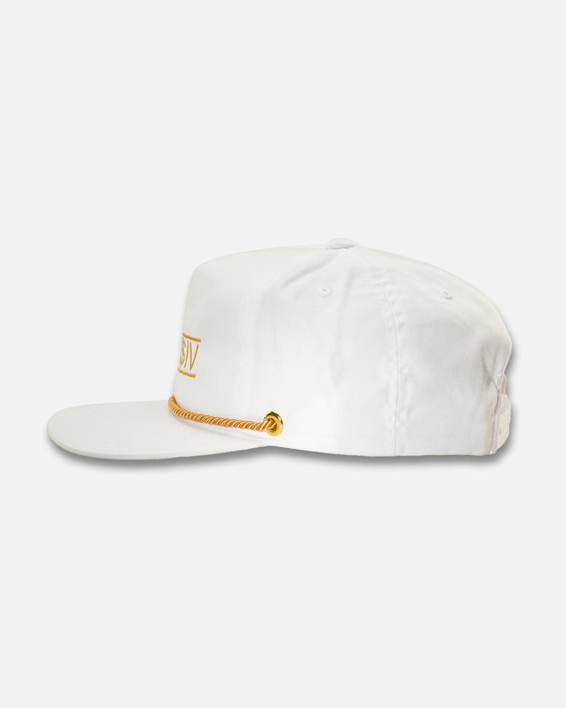 The classic Expensiv snapback in white: featuring our original Expensiv logo embroidered in gold, detailed with our signature gold braided rope through matching eyelets across the front.
