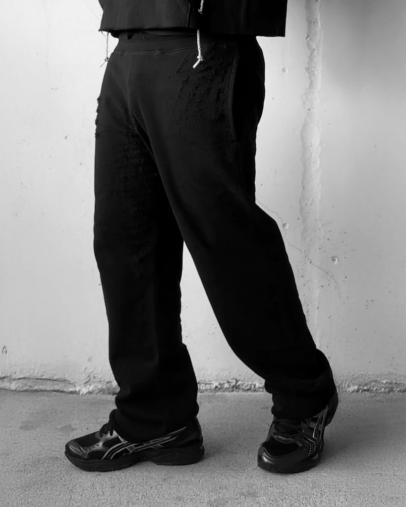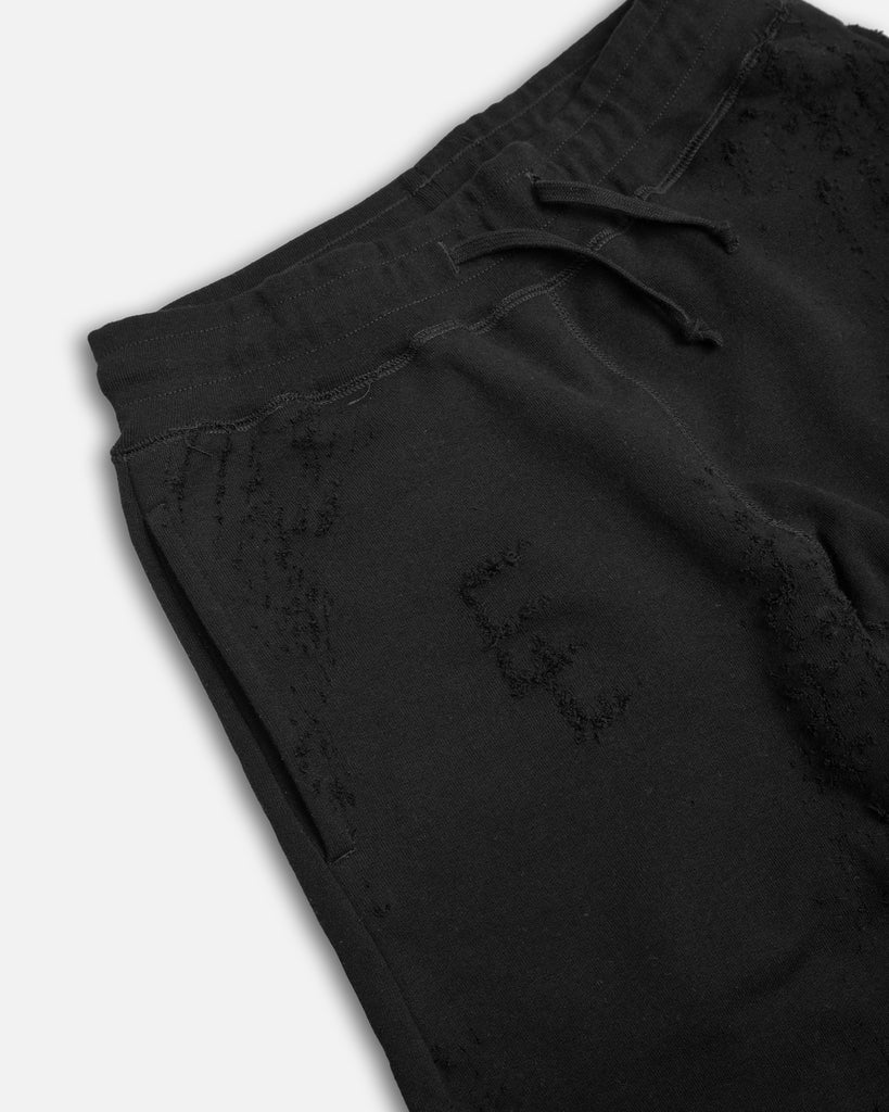 The Distressed EL sweat pant in black: premium heavyweight cotton featuring our EL logo and in-house distressing throughout. Raw cut edge leg openings for a relaxed fit.
